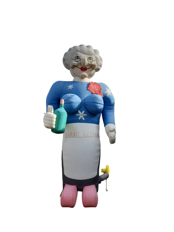 Wordt er binnenkort iemand 50 in de famailie of vriendengroep dan bieden wij deze opblaasbare Sarah op wijnvat aan ze heeft een hoogte van 3.5 meter